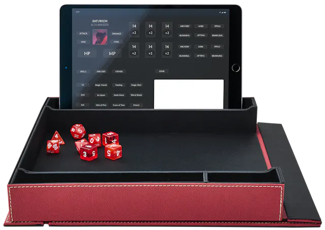 Do you use digital character sheets on a mobile phone or tablet? Use the included foam blocks and place it in the miniature compartment to rest at the perfect viewing angle while playing. The Companion can be folded if table space is tight.