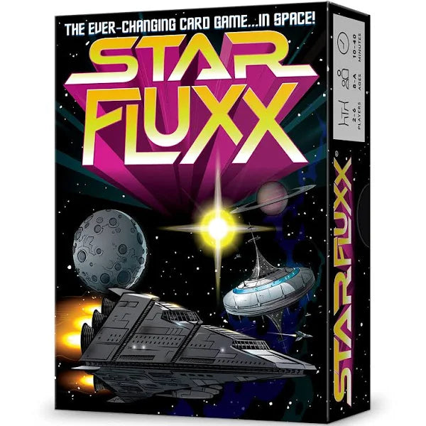 Just when you thought that Fluxx had gone as far as it could go - it blasts off for the Stars! Explore the vastness of space-themed humor with your valiant Captain, Engineer, and, of course, your Expendable Crewman. Go check out that Small Moon - or is it really a Space Station? You may be swayed by Unseen Forces, held hostage by Evil Computers, or find your ship infested with Cute Fuzzy Aliens. Beware the unexpected as Star Fluxx takes you straight into a Wormhole of hilarity. You'll find yourself wanting to play again and again - watch out... It's A Trap!